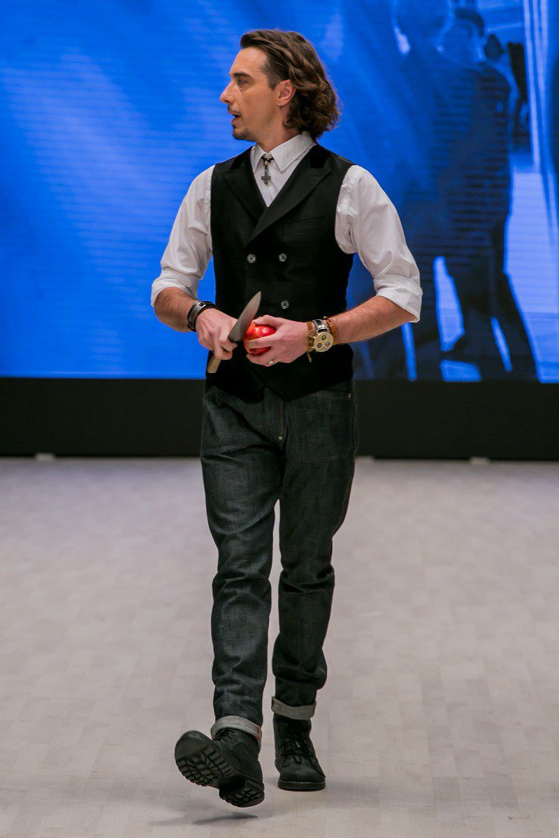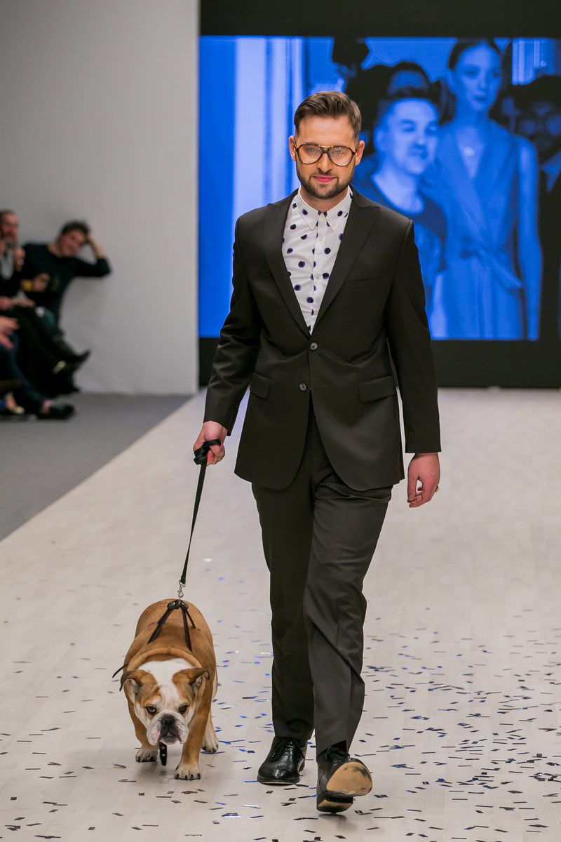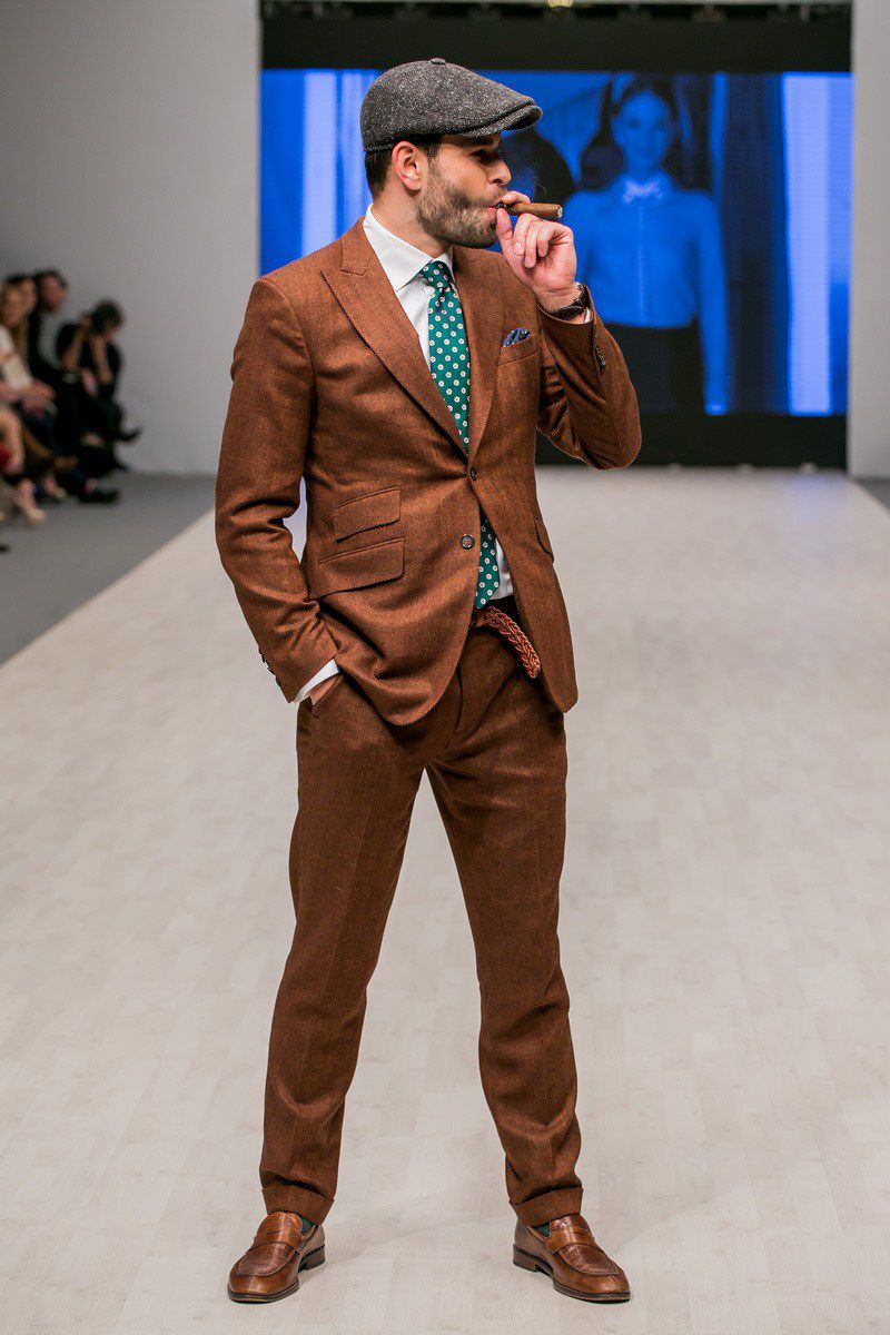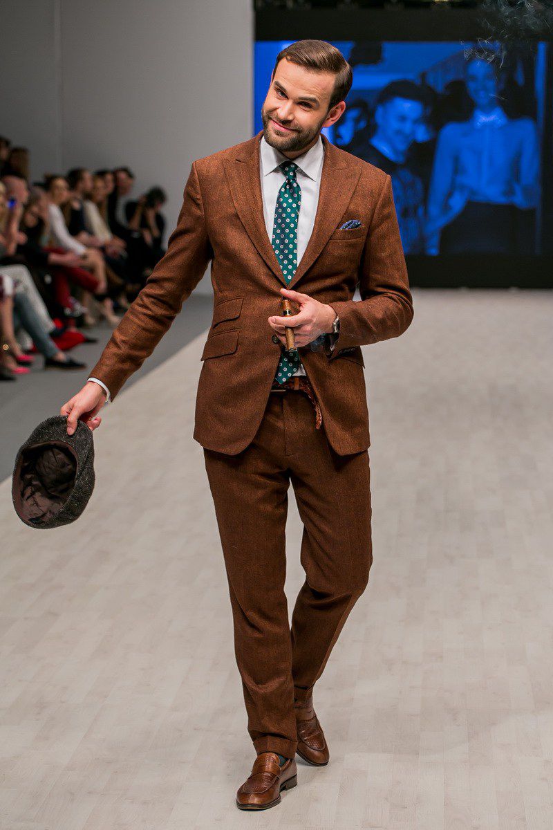 Зажигается свет, играет динамичная “хулиганская” музыка, и мы видим героя – по подиуму идет Дмитрий Кохно, с сигарой в руке, облаченный в твидовый костюм и кепку.